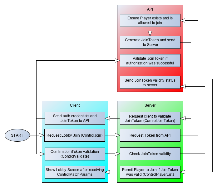 Whenever a registered Player wants to join a public server, they first need to be verified against the API before the server will permit them to join the lobby. This is implemented using a JoinToken, which is requested by a Server, sent to a client, which then uses it to authenticate itself against the API, tells the server about it and if everything is valid, the Player will be allowed to join the Lobby.